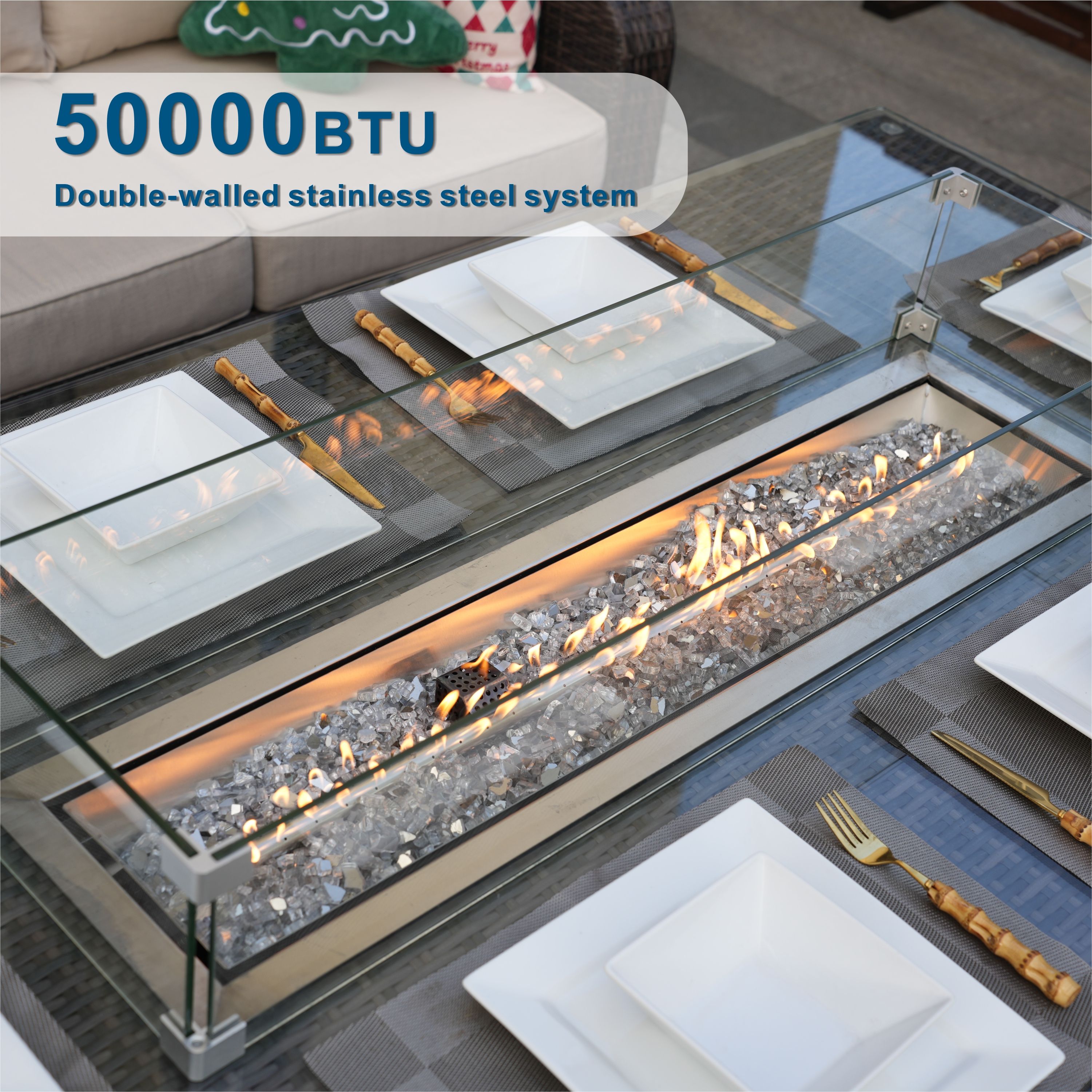 2. The set is not only a beautiful and focal central piece for your garden but is also very practical. The table has a heat adjustable stainless steel gas fire-pit. The flames emerge from the crushed glass central feature and will keep you warm and comfortable long after the sun goes down; enabling you to continue relaxing long into the night.