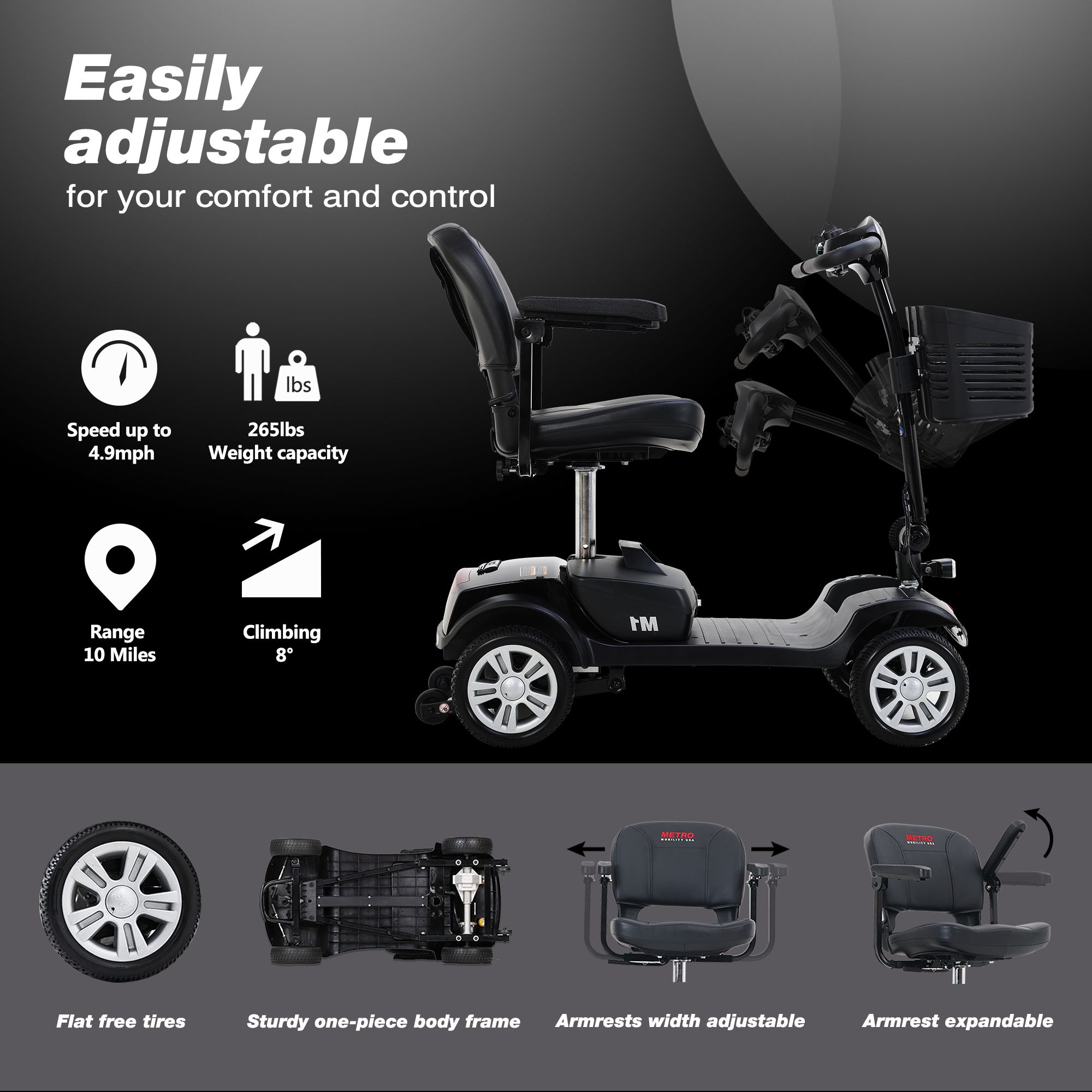 4.[Easy to Operate & Easy Disassembly] - Equipped with automatic braking mechanism, the mobility scooter will stop immediately if let go of handlebars. The machine uses sturdy one-piece body frame, which not only offers better strength, but also makes the mobility scooter super easy to assemble.