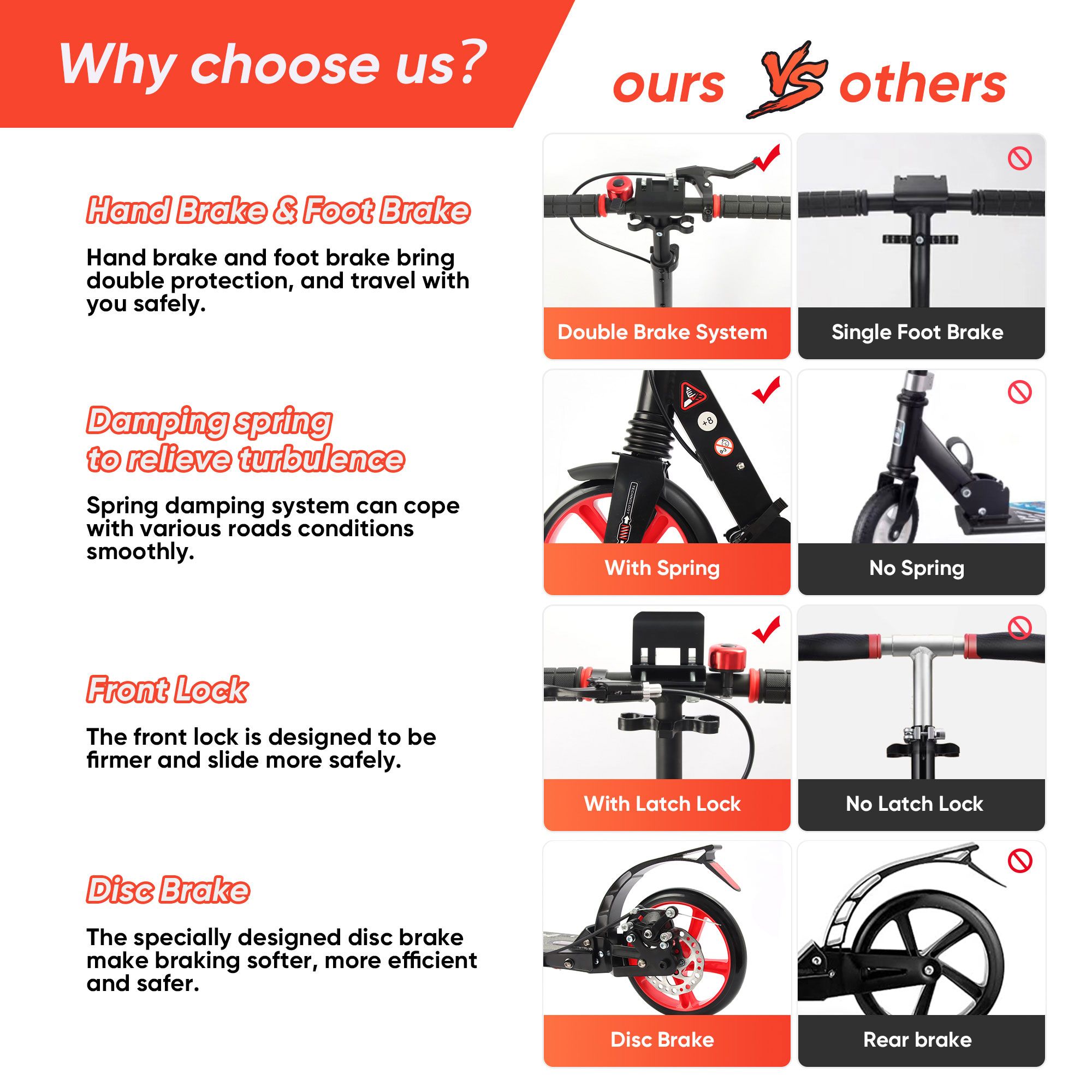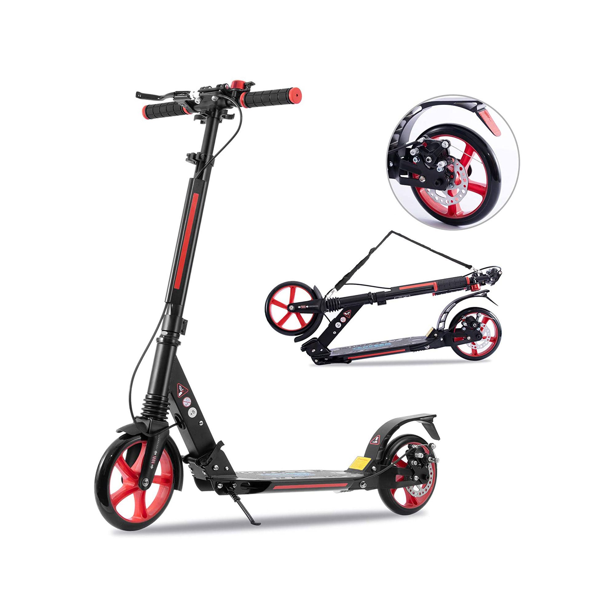 Easy to fold-adult scooter with 3 second easy to fold transport mechanism, suitable for fast storage and transportation, can be carried on a car, train or bus.Front and rear wheel dual suspension-2 wheel scooters with 200mm high durability large wheels,  precision ABEC-7 bearings, reduce bumps, make the travel smoother, and create incredible Smooth glide, ideal for urban / suburban / countryside roads.Adjustable handlebar with soft rubber comfortable handlebar, adjustable height, range 88-102cm / 34.6-40.2 inches, suitable for adults, teenagers and children over 10.Professional rear fender brake-aluminum alloy scooter has easy-to-operate rear foot brake function, which can slow down the scooter when stepped on. Large aluminum brake pedals are easy to use for fast and firm braking.One foot stands on the board and the other foot steps on the ground. After the kick scooter gets up, the feet that slide on the ground are lifted or placed on the board. The greater the pedaling force, the higher the frequency.The lower deck provides plenty of space for your feet and provides a relaxing gliding experience. Durable aluminum alloy material allows a maximum load of 220lbs (100KG).