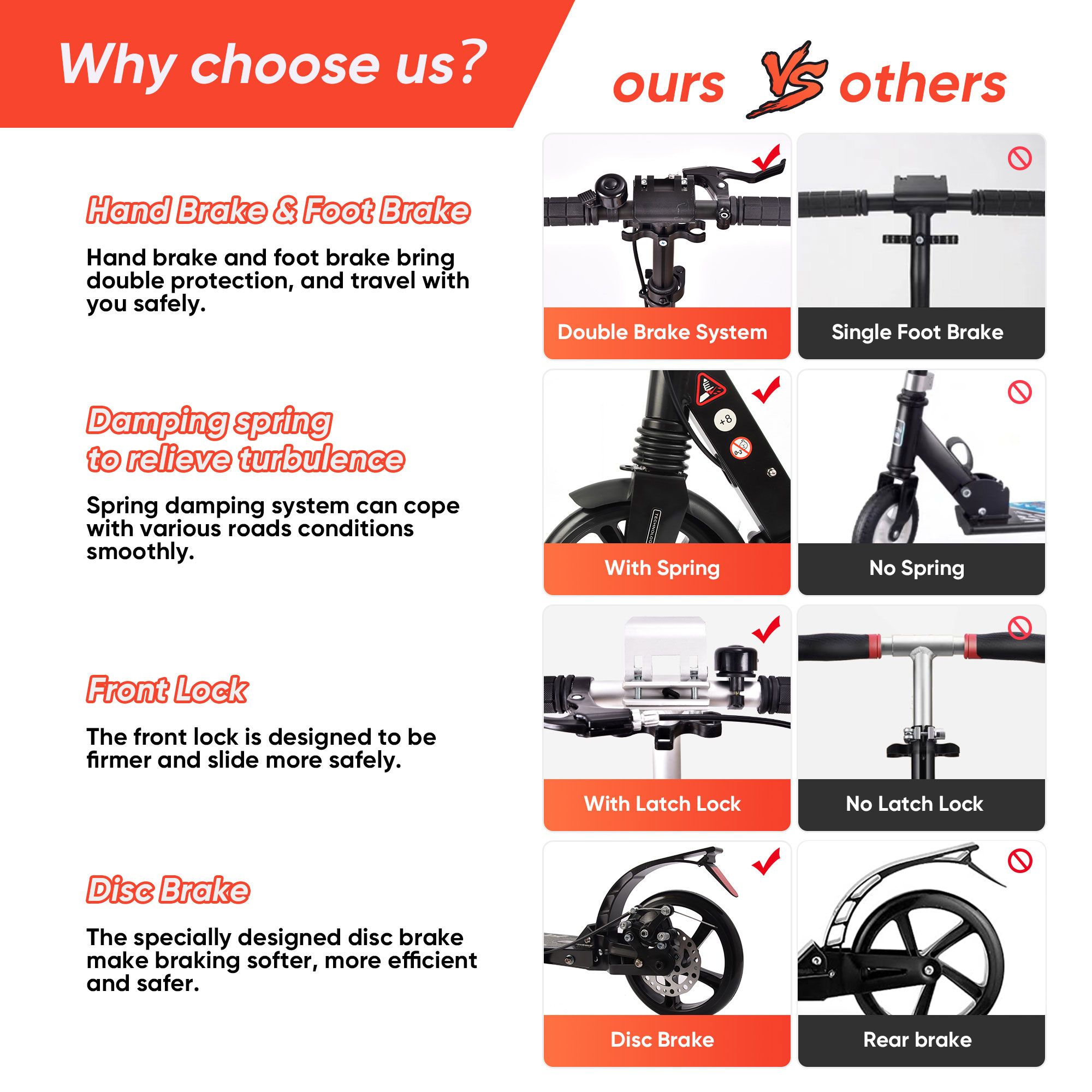 Easy to fold-adult scooter with 3 second easy to fold transport mechanism, suitable for fast storage and transportation, can be carried on a car, train or bus.Front and rear wheel dual suspension-2 wheel scooters with 200mm high durability large wheels,  precision ABEC-7 bearings, reduce bumps, make the travel smoother, and create incredible Smooth glide, ideal for urban / suburban / countryside roads.Adjustable handlebar with soft rubber comfortable handlebar, adjustable height, range 88-102cm / 34.6-40.2 inches, suitable for adults, teenagers and children over 10.Professional rear fender brake-aluminum alloy scooter has easy-to-operate rear foot brake function, which can slow down the scooter when stepped on. Large aluminum brake pedals are easy to use for fast and firm braking.One foot stands on the board and the other foot steps on the ground. After the kick scooter gets up, the feet that slide on the ground are lifted or placed on the board. The greater the pedaling force, the higher the frequency.The lower deck provides plenty of space for your feet and provides a relaxing gliding experience. Durable aluminum alloy material allows a maximum load of 220lbs (100KG).