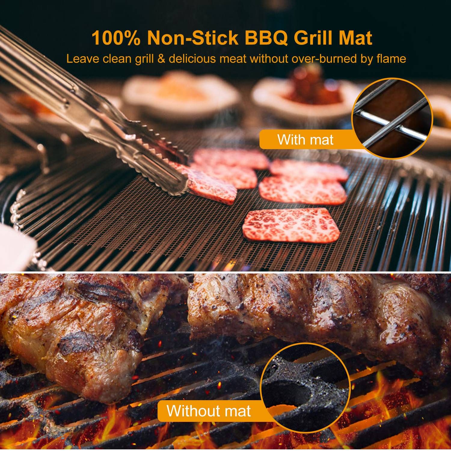 *REVERSIBLE,WASHABLE & REUSABLE*:The double-sided available grill mat can be easily cut to fit grills or oven with different size. What’s more,it is washable via dishwasher or rinse soap water for repeated use,making cleaning a breeze.