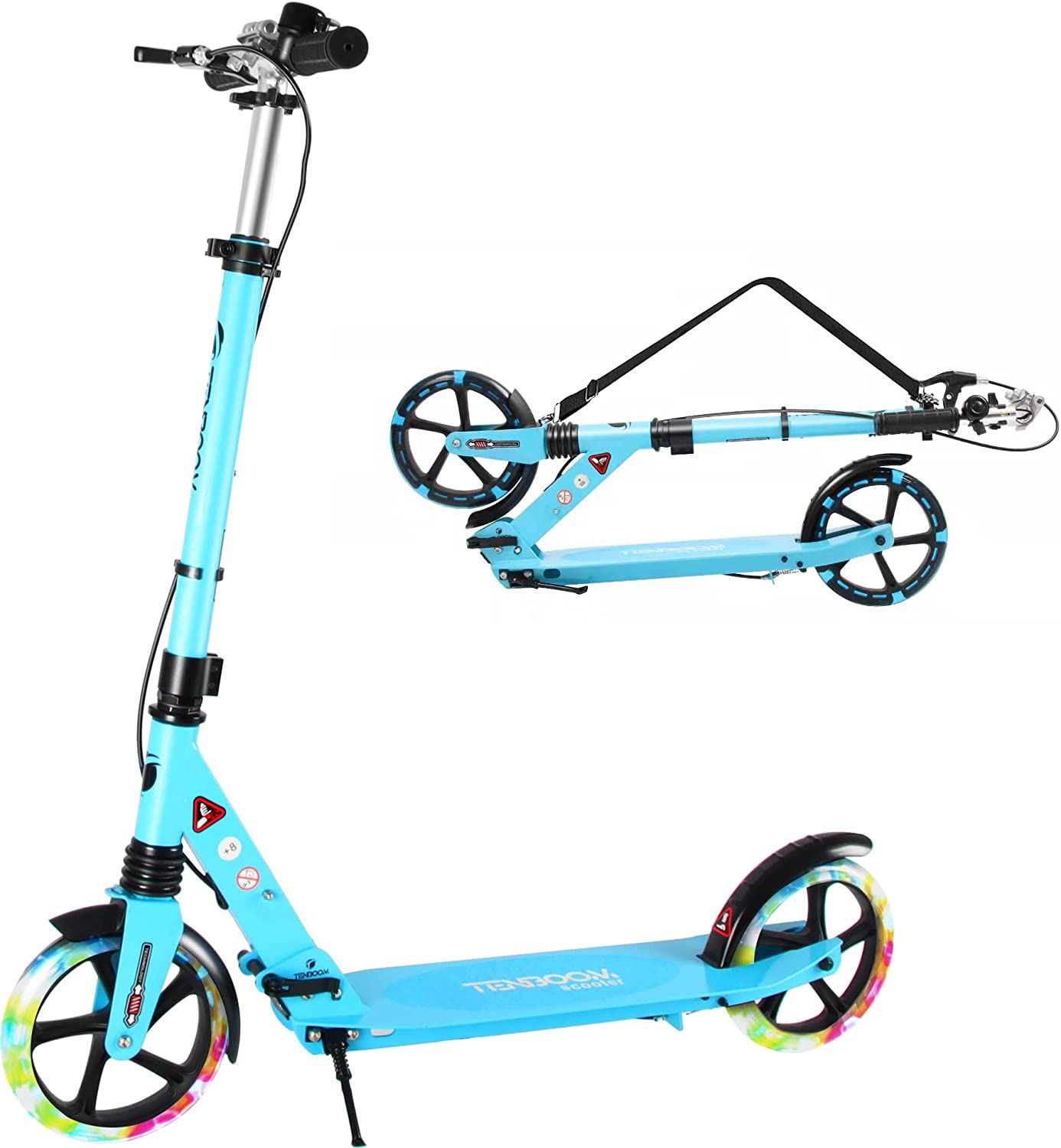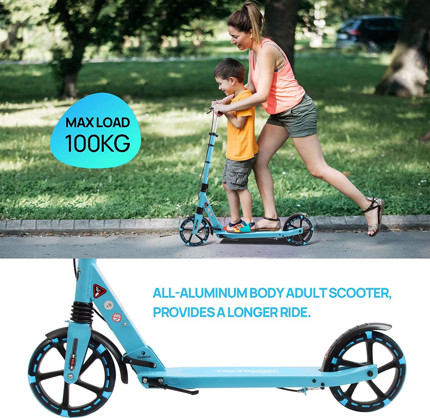 SAFE AND RELIABLE: All-aluminum body Adult and Teens Scooter. Light weight; only 11 lbs; but strong enough to support up to 220 pounds. Our kick scooter is suitable for kids ages 6-12 and adults.ADJUSTABLE HEIGHT: The handle height can be adjusted (35.4"-40.5'') to keep adults and teenager to use the scooter in a easy way. you will not need to constantly buy new scooters; it can use for the whole family.SMOOTH AND EASY RIDING: Enlarged 8" durable big PU wheels with high-speed precision ABEC-7 bearings ensure quicker and smoother ride. The effective hand and rear brake make it more comfortable on rough or uneven surfaces with fewer vibrations and secure breaking.EFFICIENT FOLDING FUNCTION: Without any tools; can be easily and safely folded and unfolded in a few seconds; easy to operate; easy to carry; take your scooter and get started!EFFICIENT FOLDING FUNCTION: Without any tools; can be easily and safely folded and unfolded in a few seconds; easy to operate; easy to carry; take your scooter and get started!GOOD FOR COMMUTING: This Tenboom adults scooter is the best adult-rider scooter to fill your needs as a city/school/travel commuting. It provides comfort and fast riding experience when speedy commute or trip around town or school. It has higher performance in comfortable size; ride feeling; large wheels; construction; lightweight; design and carry portability.