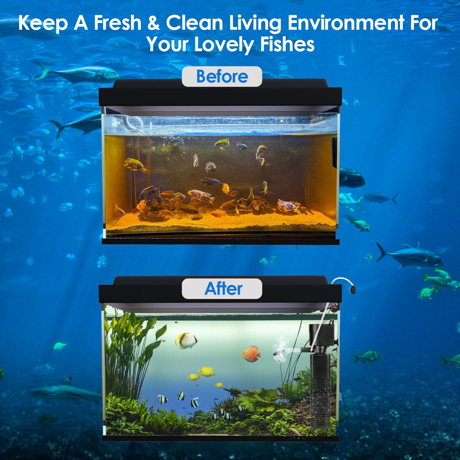 *3 Filter Options For Various Tank*:Come with 3 available powers of aquarium filters:12W,20W,30W,they adopt different powerful pumps that achieve various levels of water flow and pump head. The 12W fish tank filter is suitable for fish tank capacity under 60 gallon,20W filter is for fish tank under 110 gallon,and 30W filter fits for fish tank under 160 gallon. Choose the most appropriate internal fish tank filter according to your demands.
