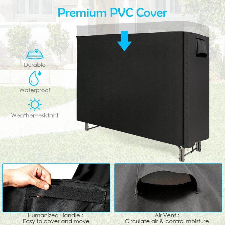 3.Unique Air Vent Design: The downward air vent protected by waterproof cloth helps to circulate air and control moisture. Raised base of the rack ensures good air ventilation. Apart from that, bottom adjustable elastic belt and buckle firmly fix the cover to the rack, which prevents the wind and rain from wetting the logs.