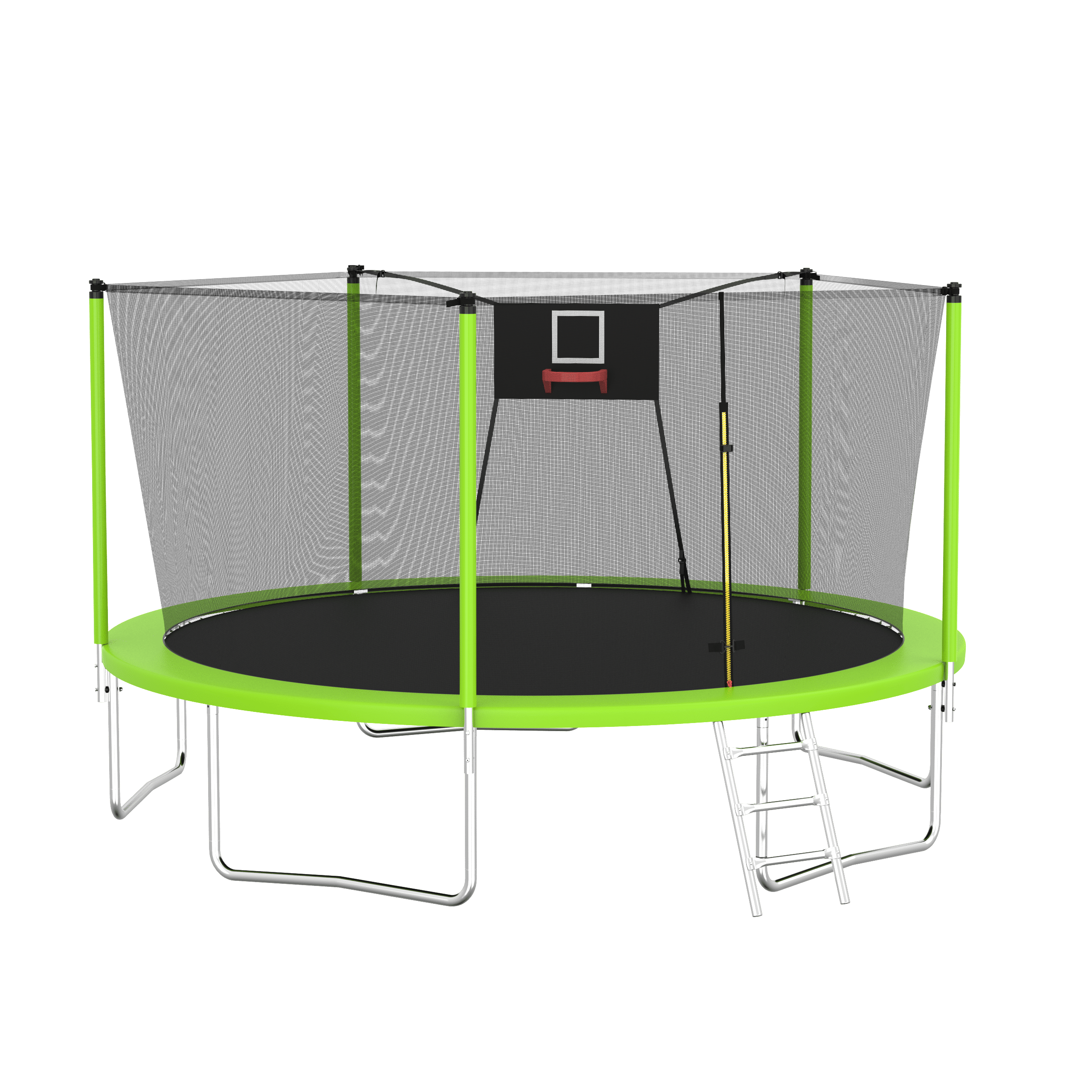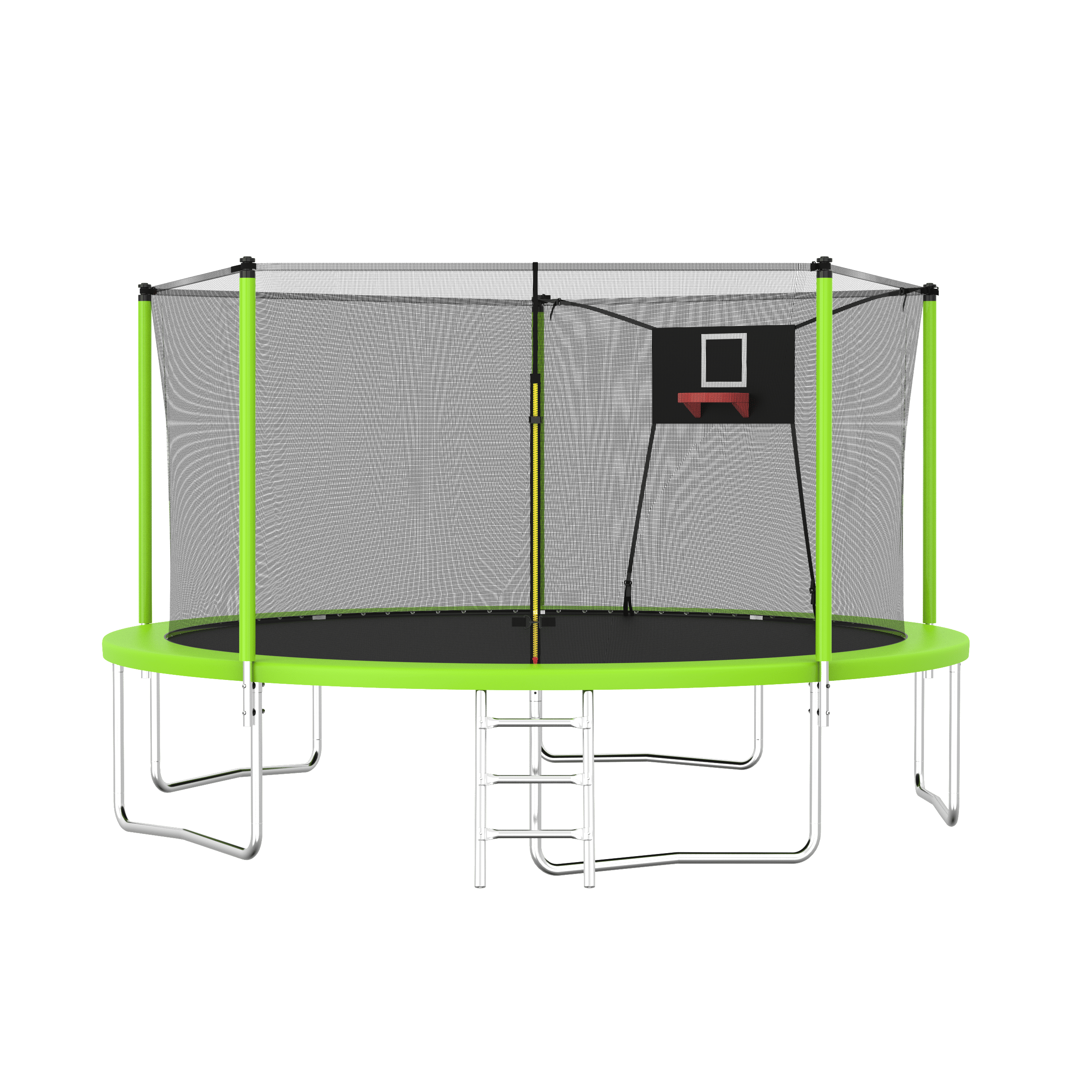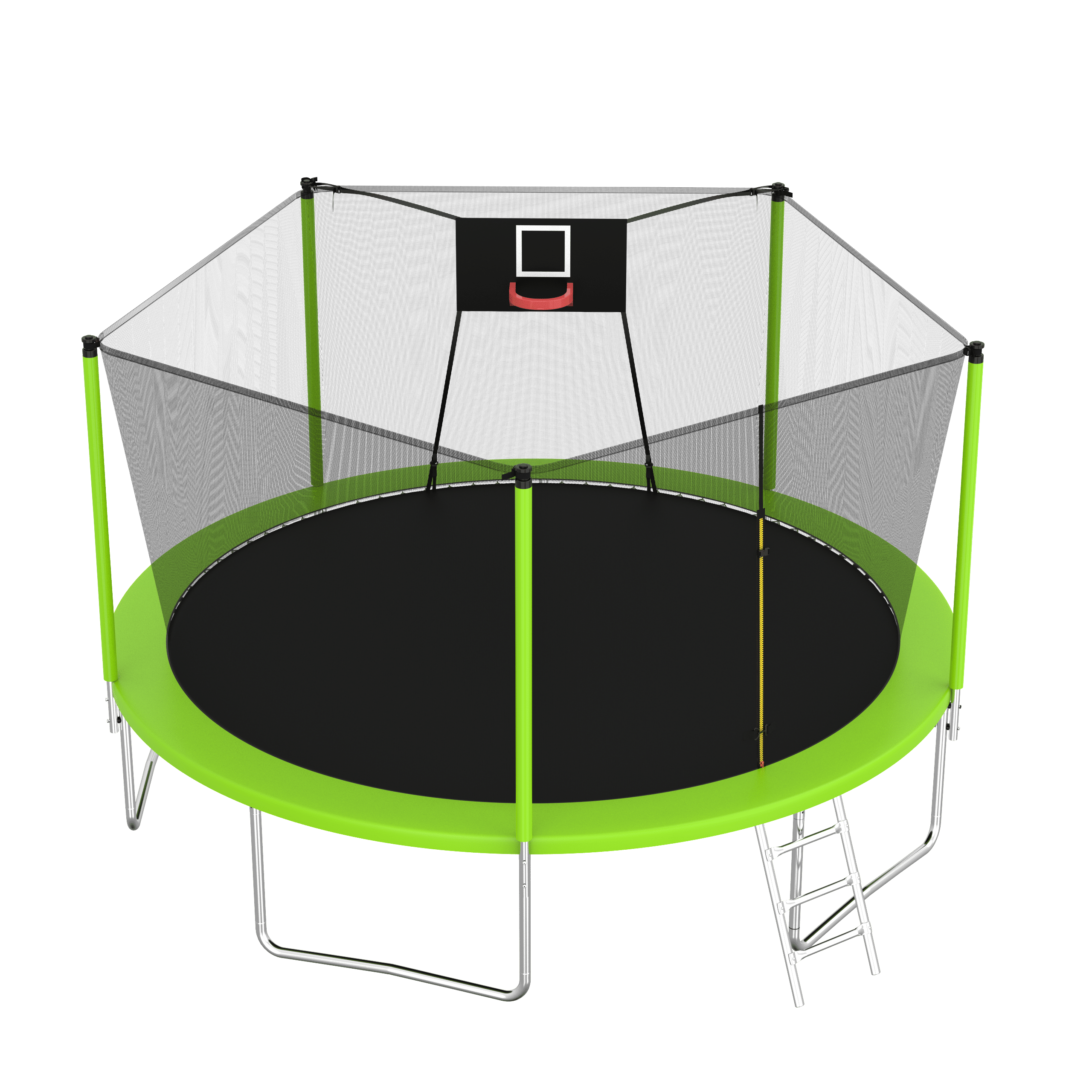 14FT Trampoline for kids Outdoor with safety net and Soft rebound and Ladder.14FT Trampoline have 5 high safety enclosure poles and heavy gauge galvanized rust resistance steel construction. 5 W-shaped legs secure stability. We have comprehensive testing of the chemical composition of the material and the structure design of the product to ensure its safety. Our safety net: PE material, sunscreen and wear resistance Passed the standard 500-hour UV test. Effectively improve the safety of trampoline performance. Galvanized spring and jumping mat: The 14 ft trampoline is equipped with 80 PCS springs with strong stretch and rebound that can improve enough bounce. And our jumper has passed 5000 hours of UV test, waterproof and sunscreen. Have plenty of space to jump.