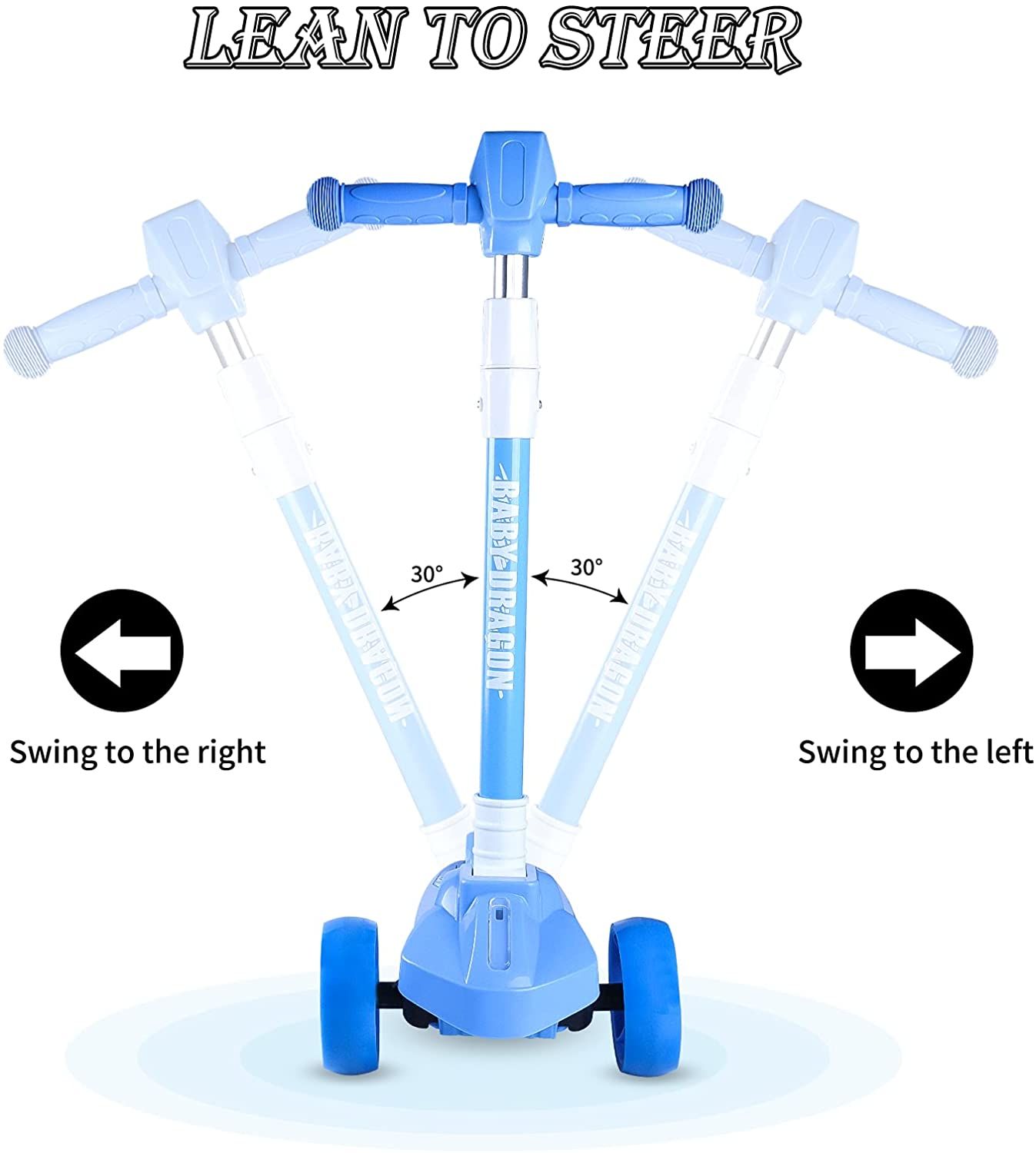 Safe; durable and tilt steering technology: adjustable T-bar (handlebar) and safe tilt steering mechanism; which means that the scooter is controlled by tilting instead of turning the steering wheel; which helps your child develop balance skills and coordination skills . The handle is very soft and can protect the child's hand from injury.