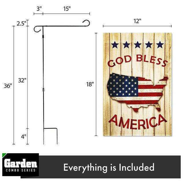 Combo Pack Garden Flag Stand Black 36x16 Inch & Garden Flag God Bless America USA Flag Map 12x18 Inch