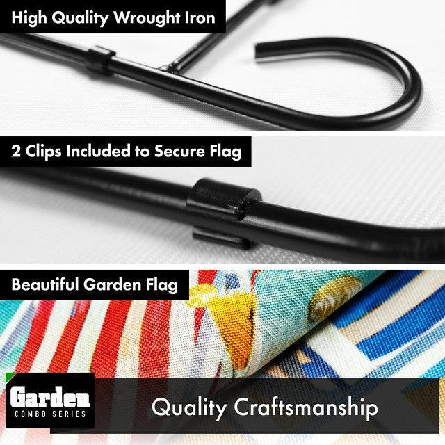 Combo Pack Garden Flag Stand Black 36x16 Inch & Garden Flag Beach Summer with Chairs Umbrella 12x18 Inch