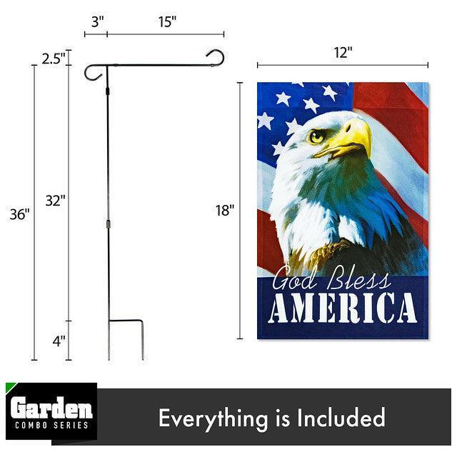 Combo Pack Garden Flag Stand Black 36x16 Inch & Garden Flag God Bless America USA Flag with Eagle 12x18 Inch